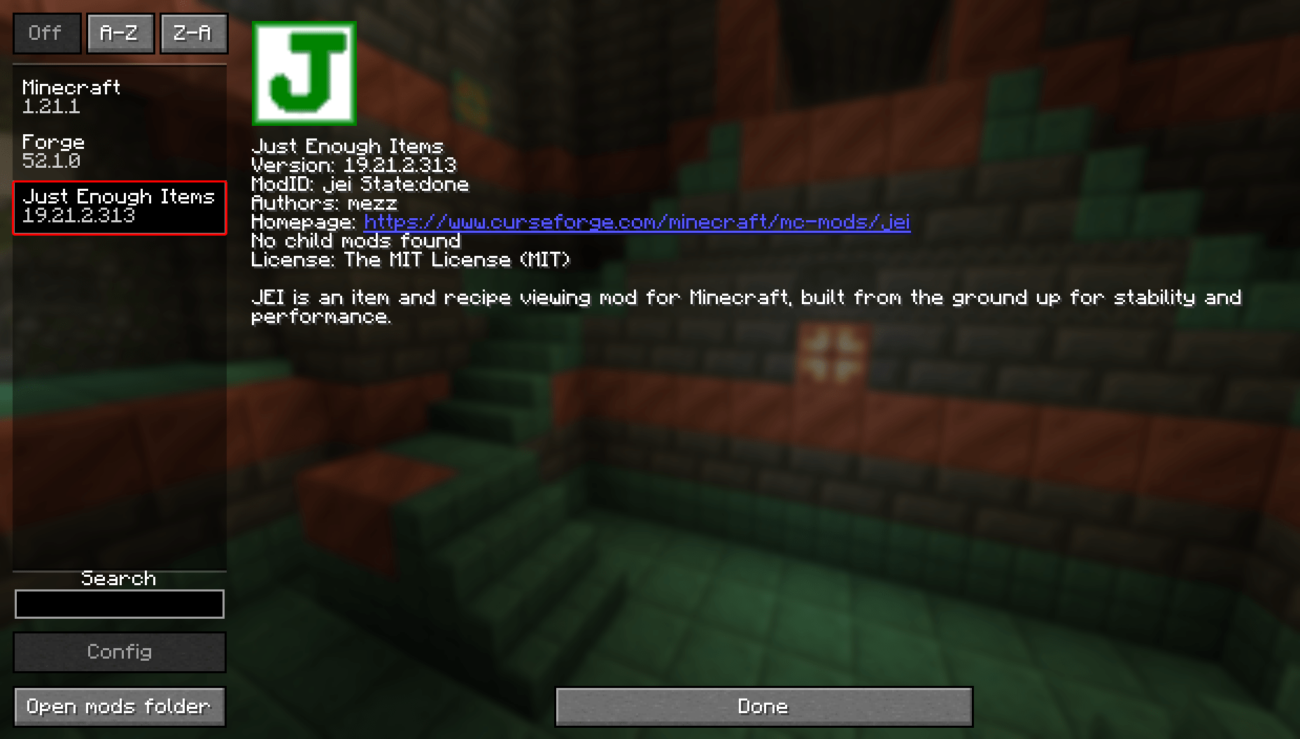 Vi kommer bara att lägga till en mod i det här exemplet, Just Enough Items, eftersom du måste bestämma vilka du vill använda. Oroa dig inte för beroenden eller versionsdiskrepanser, CurseForge kommer automatiskt att ladda ner beroenden och filtrera ut mods för olika versioner eller modloaders.