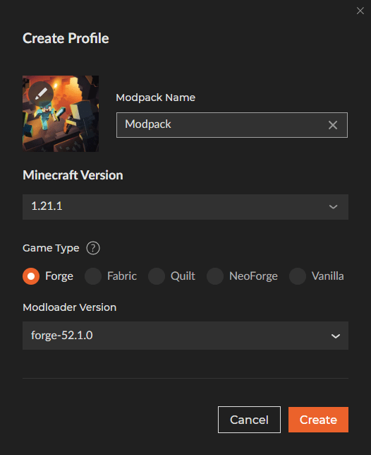 Därefter behöver du bestämma vilken version och modloader du vill använda. De två stora modloaders är Forge och Fabric, som båda har sina egna fördelar. I det här exemplet kommer vi att använda Minecraft version 1.21.1 med Forge.